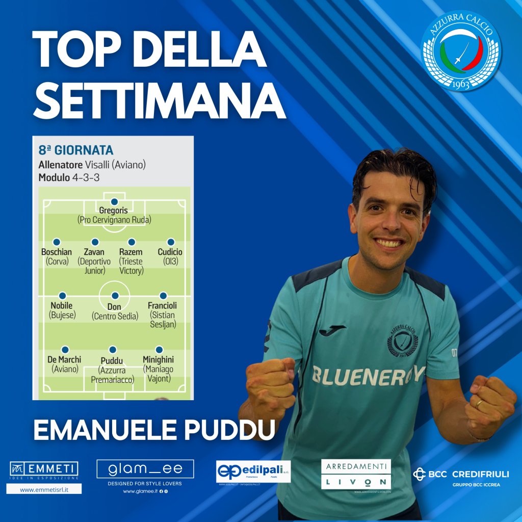 Il nostro attaccante Emanuele Puddu è stato inserito nella TOP 11 del Messaggero Veneto per quanto riguarda l’ottava giornata del campionato di Promozione Fvg. Emanuele è stato protagonista di una grande partita siglando la rete decisiva al 94′ che ha permesso all’Azzurra Premariacco di vincere la partita contro il Corno Calcio.